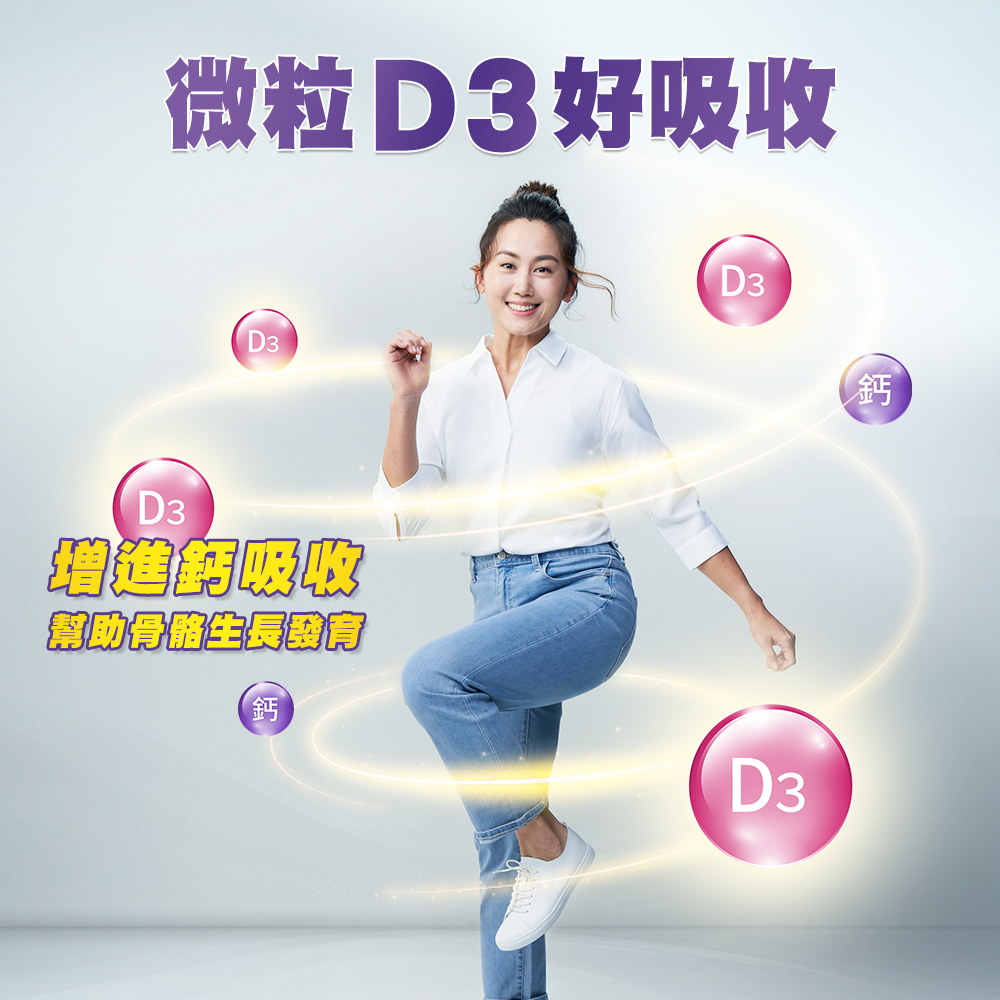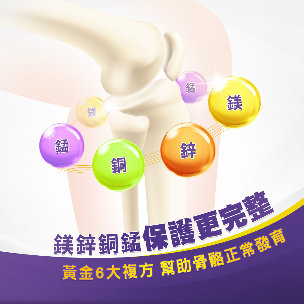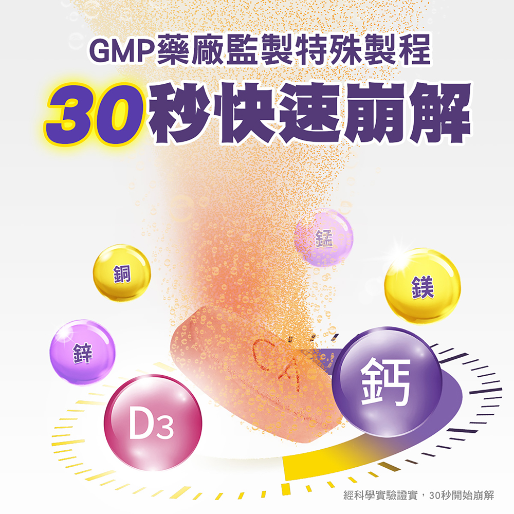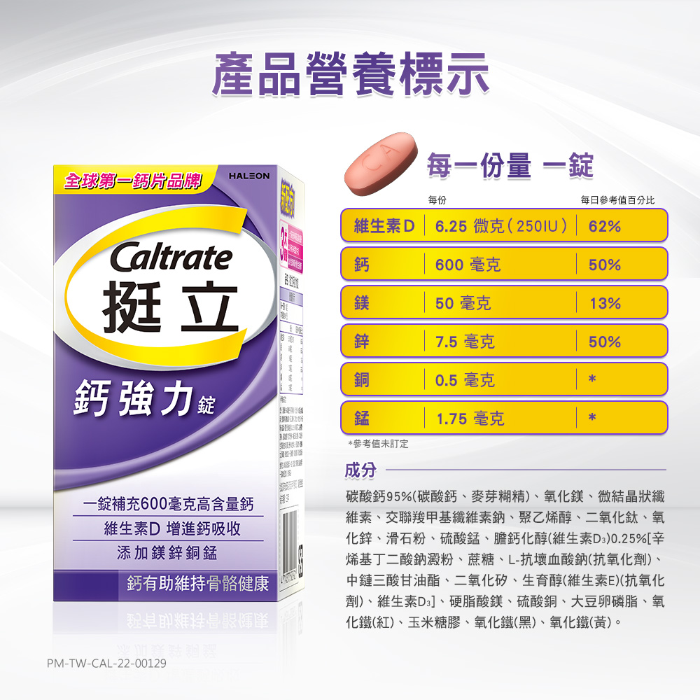 碳酸鈣(碳酸鈣、麥芽糊精)、氧化鎂、微結晶狀 a-纖維素、交聯羧甲基纖維素鈉、聚乙烯醇、二氧化鈦、氧化鋅、滑石粉、硫酸錳、膽鈣化醇(維生素 D3)[辛烯基丁二酸鈉澱粉、蔗糖、L-抗壞血酸鈉(抗氧化劑)、中鏈三酸甘油酯、二氧化矽、生育醇(維生素 E)(抗氧化劑)、維生素 D3]、硬脂酸鎂、硫酸銅、大豆卵磷脂、氧化鐵(紅)、玉米糖膠、氧化鐵(黑)、氧化鐵(黃)。