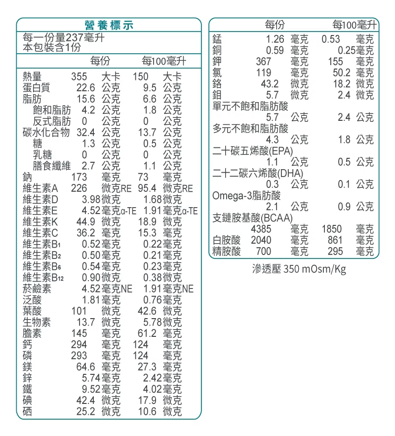 水、麥芽糊精、酪蛋白鈣(含精胺酸)、芥花油、酪蛋白鈉(含精胺酸)、中鏈三酸甘油酯(MCT)、菊糖、魚油(含EPA和DHA)、葡萄糖漿、磷酸氫二鉀、脂肪酸甘油酯、重酒石酸膽鹼、乳酸硬脂酸鈉、檸檬酸鉀、檸檬酸鈉、香料、脂肪酸蔗糖酯、碳酸鎂、氯化鈉、抗壞血酸鈉、抗壞血酸、橄欖油、葡萄籽油、羅漢果醣苷萃取物(甜味劑)、單水硫酸亞鐵、硫酸鋅、乙酸維生素E、菸鹼醯胺、本多酸鈣、二氧化矽、硫酸亞鐵、硫酸錳、辛烯