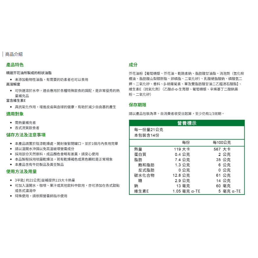 芥花油粉【葡萄糖漿、芥花油、乾酪素鈉、脂肪酸甘油酯、消泡劑(氫化棕櫚油、脂肪酸山梨醇酐酯、卵磷脂、二氧化矽)、乳酸硬脂酸鈉、磷酸氫二鉀、二氧化矽、香料、β-胡蘿蔔素、單及雙脂肪酸甘油二乙醯酒石酸酯)、維生素E(抗氧化劑)(乙酸dl-α-生育醇、葡萄糖漿、辛烯基丁二酸鈉澱粉、二氧化矽)。