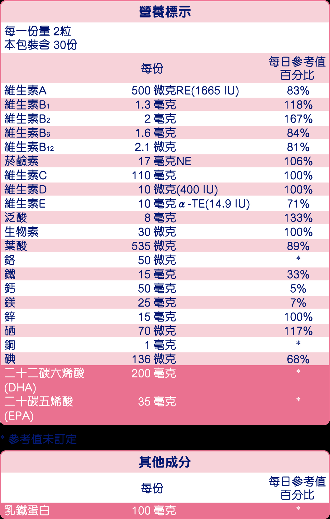 劑))、魚油(含 EPA、DHA)(魚油、混合濃縮生育醇(抗氧化劑)、葵花籽油)、亞麻仁油、碳酸鈣、乳鐵蛋白、抗壞血酸、複合甘氨酸亞鐵(甘氨酸亞鐵、檸檬酸、麥芽糊精、二氧化矽)、複合甘胺酸鋅(甘胺酸鋅、胺基乙酸、檸檬酸、二氧化矽)、氧化鎂、硒酵母、乙酸 dl-α-生育醇酯、菸鹼醯胺、脂肪酸甘油酯、大豆卵磷脂、本多酸鈣、葡萄糖酸銅、維生素 A 乙酸酯粉(乾燥葡萄糖漿、阿拉伯膠、玉米澱粉、維生素 A 乙酸酯、生育醇(抗氧化劑))、維生素 D3(辛烯基丁二酸鈉澱粉、蔗糖、L-抗壞血酸鈉(抗氧化劑)、中鏈三酸甘油酯、二氧化矽、生育醇(抗氧化劑)、維生素 D3) 、維生素 B6、維生素 B1、維生素 B2、L-5-甲基四氫葉酸鈣、吡啶甲酸鉻、碘化鉀、生物素、維生素 B12。 膠皮成分: 明膠、甘油、純水、焦糖色素粉。