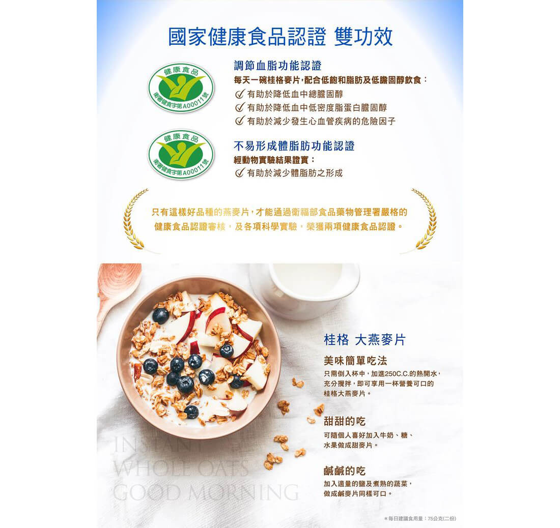 .好功效:唯一雙認證燕麥片,降膽固醇,降體脂 .好品質:澳洲進口優質麥粒 .好製程:整粒碾壓, 顆粒大, 完整保留麥粒纖維 .好新鮮:充氮鐵罐包裝,風味新鮮不嗆鼻